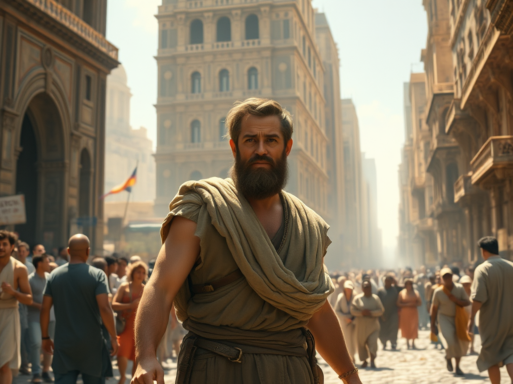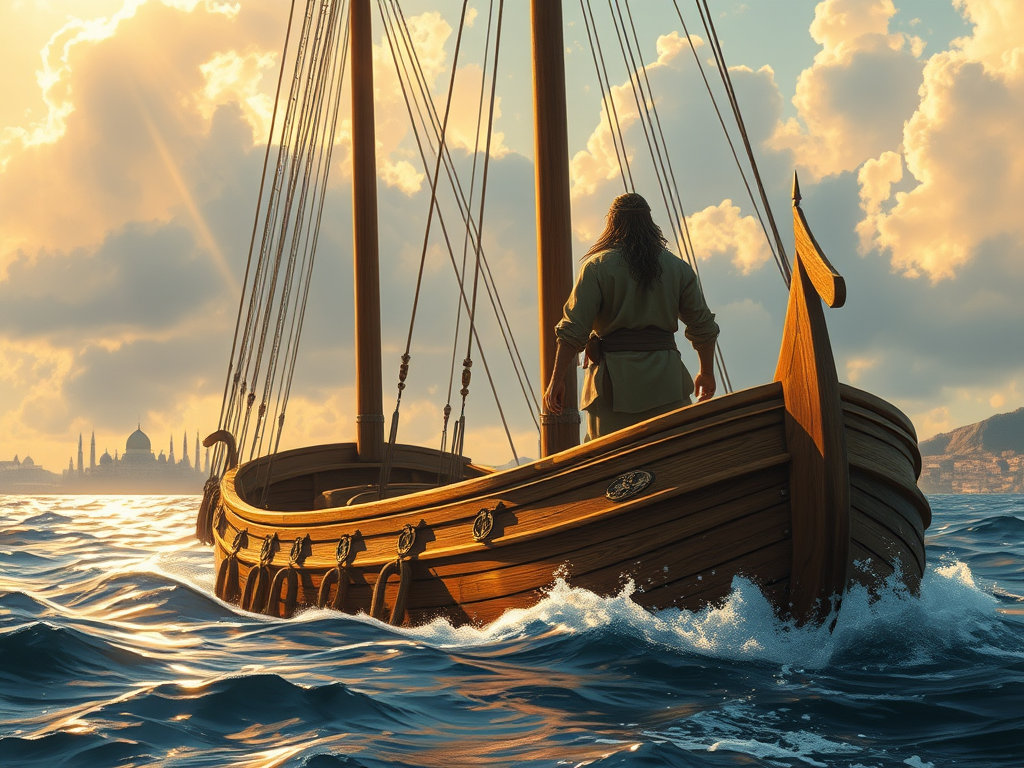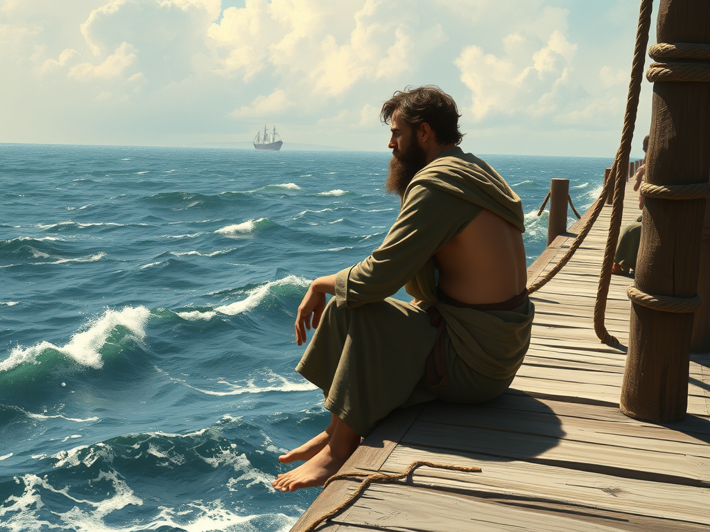 The sun hung low in the sky, casting a warm glow over the bustling streets of Joppa. Jonah, a young man with tousled hair and a restless spirit, sat on the edge of the dock, his feet dangling above the water. His friend Eli, a curious and adventurous soul, plopped down beside him.