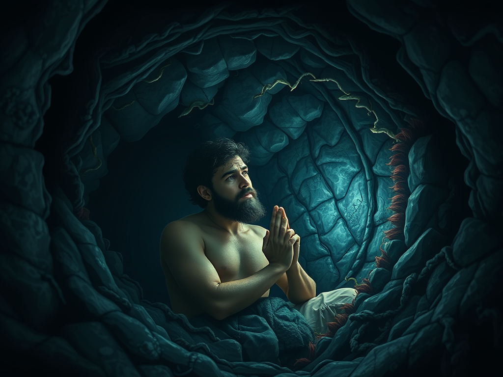 Suddenly, a great fish swallowed him whole. Inside the dark belly, Jonah found himself surrounded by seaweed and darkness. “This is my punishment,” he thought, despair creeping in.